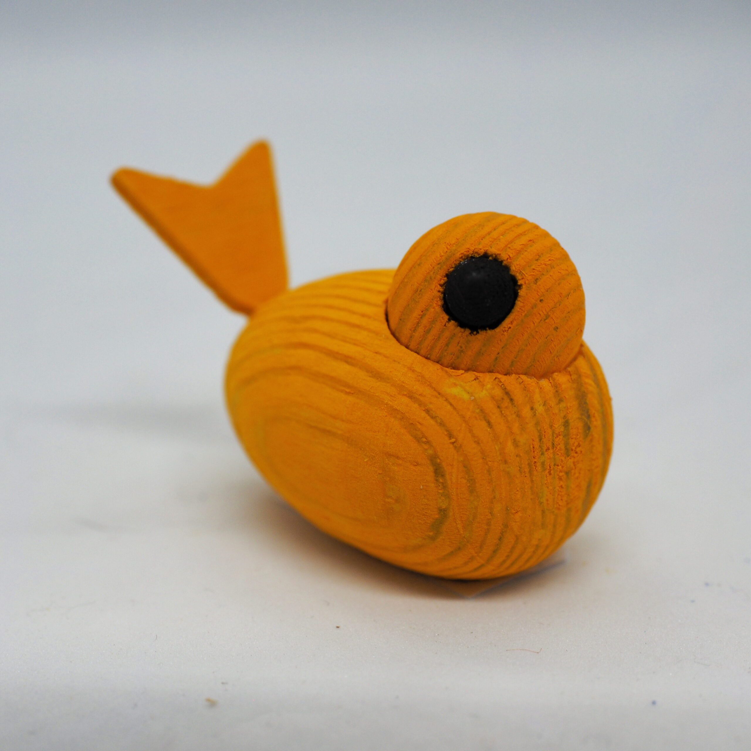 Gul fugl med hodet vendt til siden. lagd av tre. Passer utmerket som dekorasjon til for eksempel påskebordet.